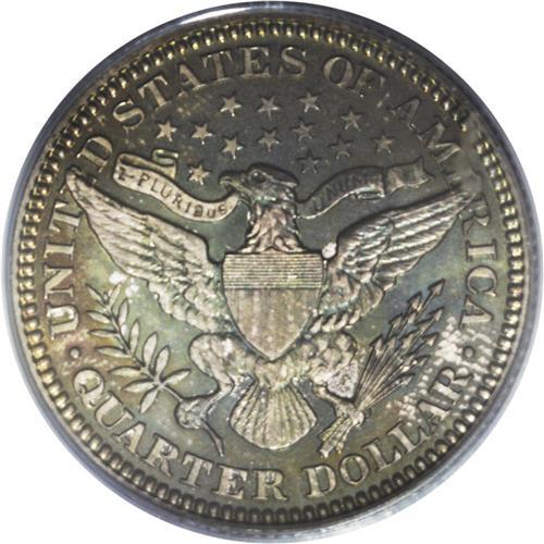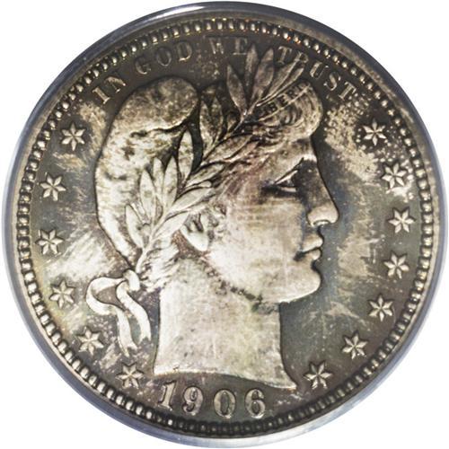 <B>1906<25C> PR66 PCGS.</B></I> Sharply struck with variegated green, rose, and orange-gold patina. The obverse shows a faint fingerprint impression. The toning obscures the reflectivity of the fields, but both sides of the piece seem to be free of hairlines or contact marks. An impressive grade for this issue. Population: 28 in 66, 20 finer (8/06).