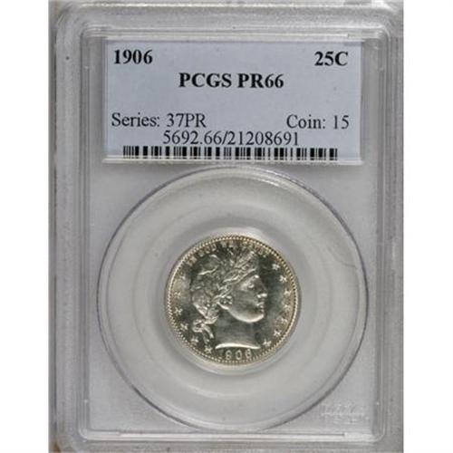 <B>1906 25C PR66 PCGS.</B></I> The Barber design generated less enthusiasm than its Seated predecessor, and no 20th century proof of the former design reached a four-figure mintage. The gleaming, modestly contrasting silver-white specimen offered here is one of just 675 pieces coined. Population: 31 in 66, 19 finer (8/07).<BR><BR><B>Coin Engraver:</B> Charles E. Barber<BR><BR><b>Shipping:</b> Coins & Currency (<a target="_blank" href="http://www.heritageauctions.com/common/shipping.php">view shipping information</a>)