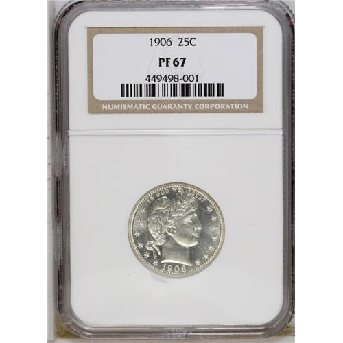 <B>1906 25C PR67 NGC.</B></I> Unimpeachable striking details are matched with impeccably preserved surfaces on each side of this marvelous Superb Gem proof. There is a slight degree of mint frost on the central devices, but not enough to garner the Cameo designation from NGC. Census: 27 in 67, 6 finer (11/06).<BR><BR><b>Shipping:</b> Coin/Currency (<a target="_blank" href="http://www.heritageauctions.com/common/shipping.php">view shipping information</a>)
