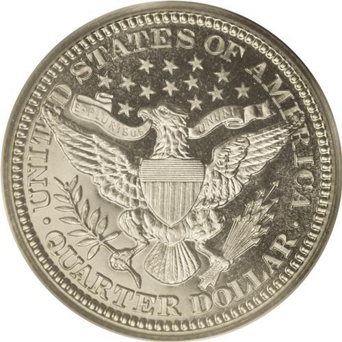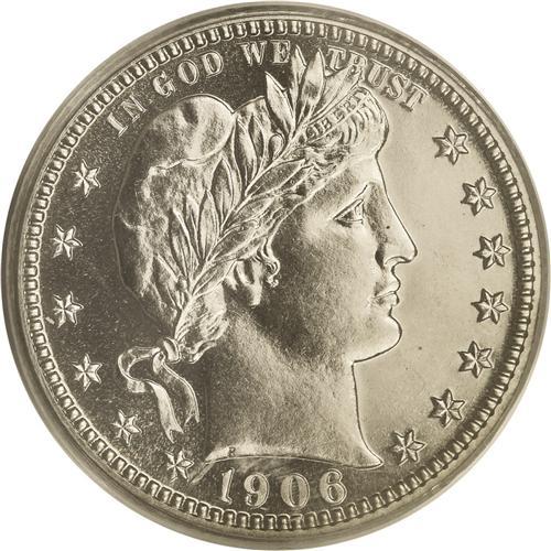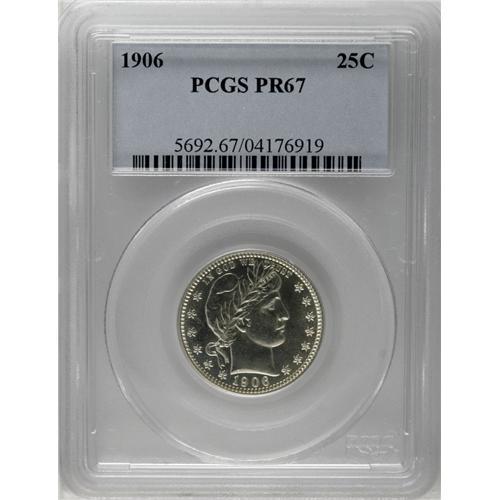<B>1906<25C> PR67 PCGS.</B></I> Examination under a loupe only confirms the exemplary quality. A brilliant Superb Gem that has an above average strike and noticeable frost on the eagle. 1906 is one of the few dates in the proof Barber quarter series that are almost never found with cameo contrast. A scant 675 proofs were produced.<BR><I>From The Mulholland Collection.</B></I>
