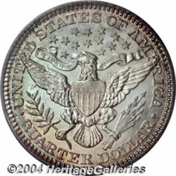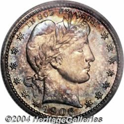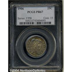 <B>1906<25C> PR67 PCGS.</B></I> Both sides of this Superb proof striking show unfathomable depth of mirrored reflectivity, which is immediately apparent even through the colorful layers of toning that is present over each side. The obverse shows rich turquoise-blue toning sandwiched between layers of reddish-golden and antique-golden coloration. The reverse, on the other hand, shows more subtle shades of soft-gold, blue, and lime-green at selected border areas with significant portions of original mint brilliance over most of that side. If there are any defects on the surfaces of this exceptional coin we are unable to locate them. Wonderful technical quality combined with unbeatable eye appeal. Population: 17 in 67, 2 finer (3/04).<BR><I>From the JFS Collection.</B></I> <BR><BR><B>Important notice:</B> Heritage usually auctions material at the rate of 200-250 lots per hour. On some occasions eBay Live bid software or the Internet may not be able to keep up with the pace of the auction. We recommend placing a realistic absentee bid now as insurance to avoid disappointment. Occasionally the auctioneer may eliminate or reject an eBay Live bid, and the auctioneer may also reopen a lot after the close of the eBay live bidding (usually because we missed an audience bid), and may reject your bid even if it shows you as the winning bidder. By bidding via eBay Live, you agree that Heritage may award the lot to another bidder at its sole discretion under the circumstances described above or any other reasonable circumstances. Since eBay bids are not shown to us until we open the lot on the floor, we treat those bids just like floor bids. In most cases the floor responds before the eBay bid is presented to us, due to Internet lag time, so for consistency we have made it a policy that floor bids are always considered first over tie eBay live bids. Also please note that all Heritage lots purchased through eBay Live carry a 20% Buyer's Premium. Please make sure you read the Terms and Conditions before you bid. </span></font></tr></table></td></tr></table>