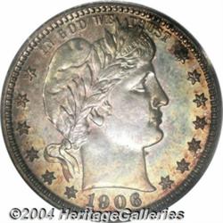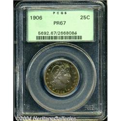 <B>1906<25C> PR67 PCGS.</B></I> The obverse is a melange of yellow-gold, sea-green, violet, and pale blue toning, while the reverse is mostly pale blue and light violet. The obverse surfaces are somewhat brighter than the reverse, and boldly impressed design elements characterize each side. No serious blemishes appear to impact the well preserved surfaces of this lovely Barber quarter. Population: 17 in 67, 2 finer (3/04).<BR><I>Ex: Exclusive Internet #21051 (Heritage, 5/01), lot 1187, which realized $3,700.</B></I><BR><I>From the JFS Collection.</B></I> <BR><BR><B>Important notice:</B> Heritage usually auctions material at the rate of 200-250 lots per hour. On some occasions eBay Live bid software or the Internet may not be able to keep up with the pace of the auction. We recommend placing a realistic absentee bid now as insurance to avoid disappointment. Occasionally the auctioneer may eliminate or reject an eBay Live bid, and the auctioneer may also reopen a lot after the close of the eBay live bidding (usually because we missed an audience bid), and may reject your bid even if it shows you as the winning bidder. By bidding via eBay Live, you agree that Heritage may award the lot to another bidder at its sole discretion under the circumstances described above or any other reasonable circumstances. Since eBay bids are not shown to us until we open the lot on the floor, we treat those bids just like floor bids. In most cases the floor responds before the eBay bid is presented to us, due to Internet lag time, so for consistency we have made it a policy that floor bids are always considered first over tie eBay live bids. Also please note that all Heritage lots purchased through eBay Live carry a 20% Buyer's Premium. Please make sure you read the Terms and Conditions before you bid. </span></font></tr></table></td></tr></table>
