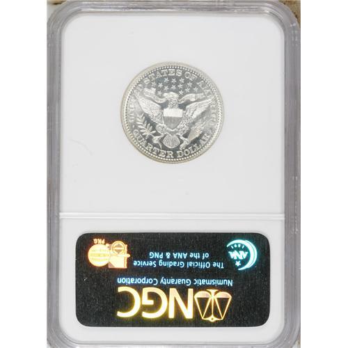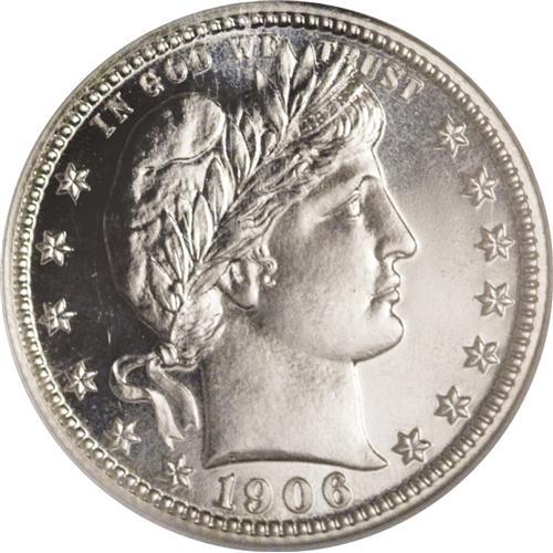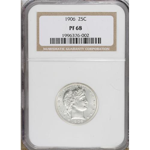 <B>1906 25C PR68 NGC.</B></I> It would appear, based on NGC and PCGS census and population figures, that a fair number of 1906 proof quarters, with a mintage of 675 pieces, have survived to the present day. The two services combined have certified approximately 360 examples. The pickings become quite sparse, however, when the lofty grade of PR68 is reached. Brilliant surfaces on this specimen seem to jump out at the observer. There are no noticeable hairlines, and sharply struck design features prevail throughout. A tiny fleck in the left obverse field identifies the coin. Census: 6 in 68, 0 finer (4/07).<BR><BR><b>Shipping:</b> Coins & Currency (<a target="_blank" href="http://www.heritageauctions.com/common/shipping.php">view shipping information</a>)