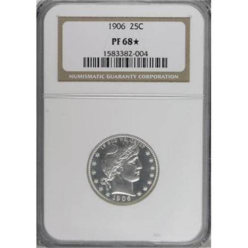 <B>1906 25C PR68</B></I> S<B> NGC.</B></I> Fully brilliant silver-white surfaces are entirely void of toning on either side. Light cameo contrast is visible on the obverse, with deeper contrast on the reverse. Considered separately, the reverse seems to have strong enough contrast for a Cameo designation. This example is the single finest 1906 proof quarter that NGC has ever graded.<BR><BR><B>Coin Engraver:</B> Charles E. Barber<BR><BR><b>Shipping:</b> Coins & Currency (<a target="_blank" href="http://www.heritageauctions.com/common/shipping.php">view shipping information</a>)
