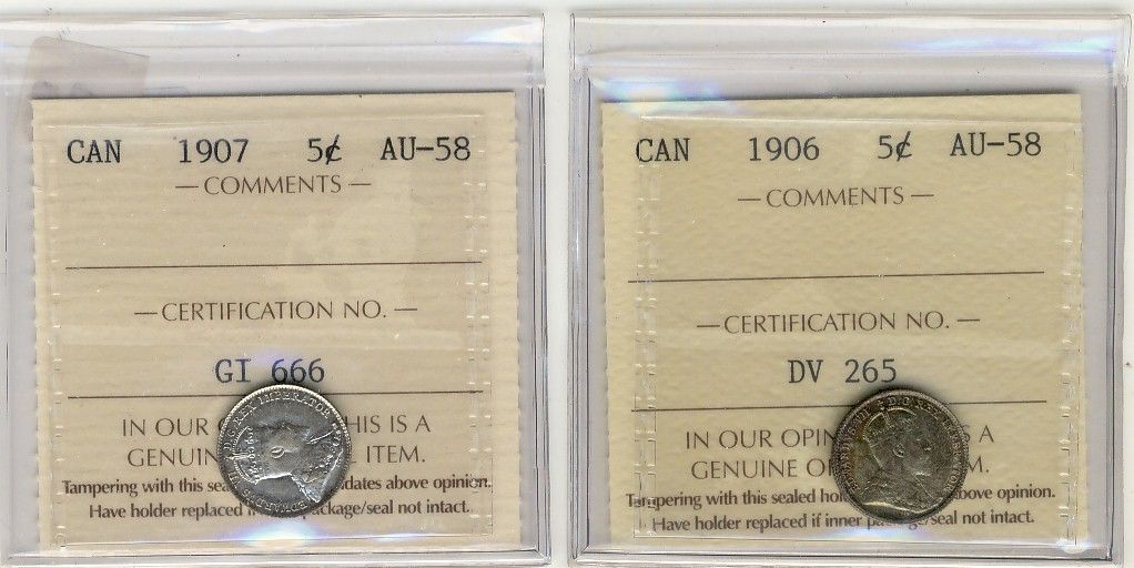 1906 5¢ & 1907 ICCS AU58. Lot of 2 coins.