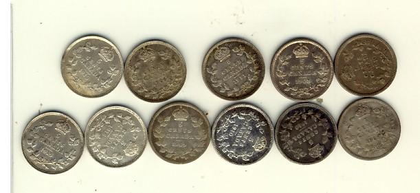 1906 5¢, 1908 Sml 8(2), 1909 Ptd Lvs, 19010 Rd Lvs(3), 1911 & 1915(3). Lot of 11 coins all VF+ to E