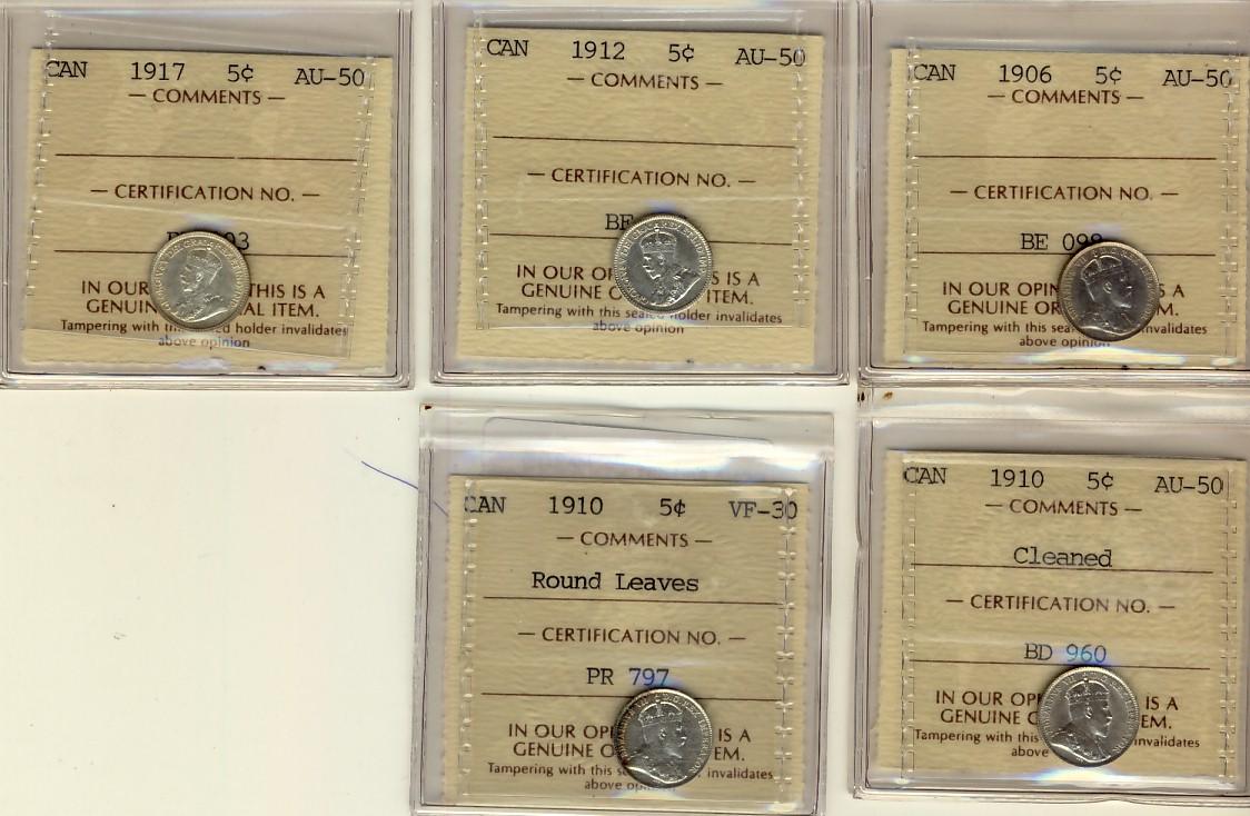 1906 5¢, 1910, 1912, 1917 AU50 & 1910 RL VF30. Lot of 5 ICCS graded coins. 1910 designated cleaned. All in old ICCS holders.