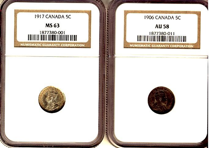 1906 5¢ AU58 & 1917 Ms63. Lot of 2 NGC graded coins.