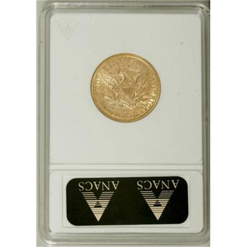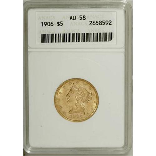 <B>1906 $5 AU58 ANACS.</B></I> NGC Census: (104/1745). PCGS Population (127/1105). Mintage: 348,700. Numismedia Wsl. Price for NGC/PCGS coin in AU58: $196. (#8413)<BR><BR><B>Coin Engraver:</B> Christian Gobrecht<BR><BR><b>Shipping:</b> Coins & Currency (<a target="_blank" href="http://www.heritageauctions.com/common/shipping.php">view shipping information</a>\)
