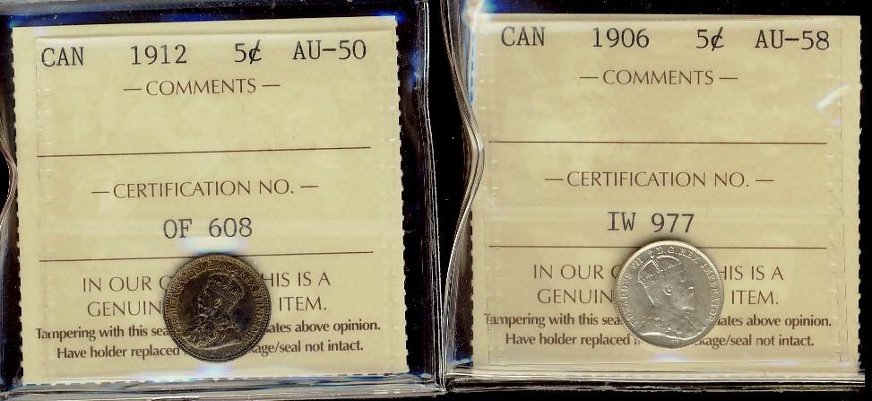 1906 5¢ ICCS AU58, 1912 5¢ ICCS AU50, Lot of 2 coins,