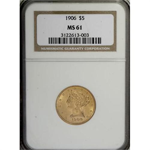 <B>1906 $5 MS61 NGC.</B></I> . NGC Census: (461/1318). PCGS Population (185/903). Mintage: 348,700. Numismedia Wsl. Price for NGC/PCGS coin in MS61: $305. (#8413)<BR><BR><B>Coin Engraver:</B> Christian Gobrecht<BR><BR><b>Shipping:</b> Coins & Currency (<a target="_blank" href="http://www.heritageauctions.com/common/shipping.php">view shipping information</a>)