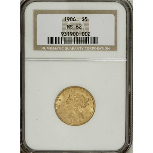 1906 $5 MS62 NGC. NGC Census: (687/526). PCGS Popu