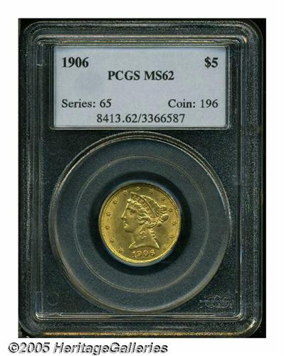 <B>1906<$5> MS62 PCGS.</B></I> Likely Breen-6792, "Extremely rare." The date shows possible recutting, most apparent within the loop of the 6 and on the ball of the 9. This well struck example has good luster and a hidden mark on the top edge of the upper arrow head.