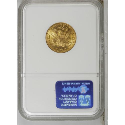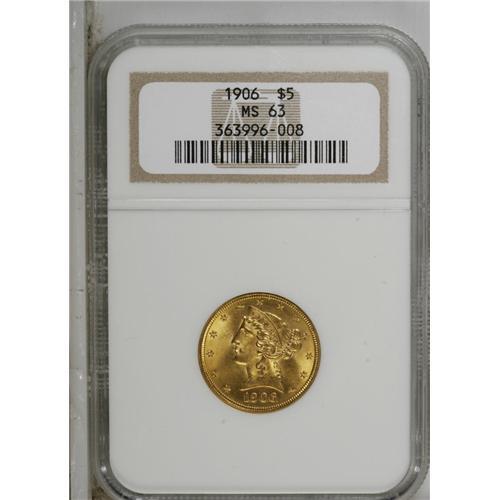 <B>1906 $5 MS63 NGC.</B></I> Select and well struck with smooth and lustrous yellow-orange surfaces. The minor marks that appear in the fields are few and far between.<BR><BR><b>Shipping:</b> Coin/Currency (<a target="_blank" href="http://www.heritageauctions.com/common/shipping.php">view shipping information</a>)