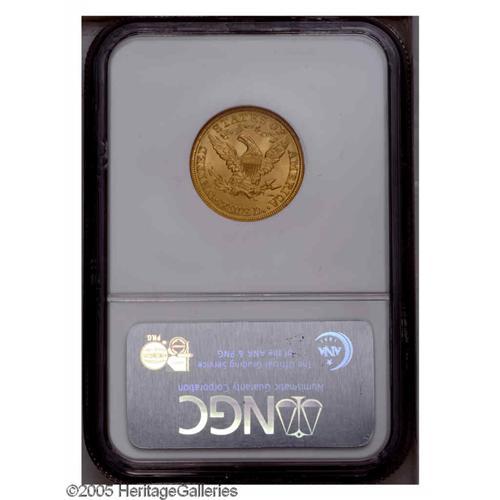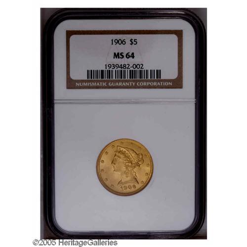 <B>1906<$5> MS64 NGC.</B></I> This lustrous apricot-gold beauty is sharply struck and carefully preserved. Available in lowly Mint State grades, but scarce as a near-Gem. Probably Breen-6792, the loop of the 6 in the date exhibits recutting. Breen's Open and Closed 6 varieties are caused by the depth of the date logotype within the die. A deeply impressed logotype, as found on the present piece, has a Closed 6, while a lighter impression leads to an Open 6.