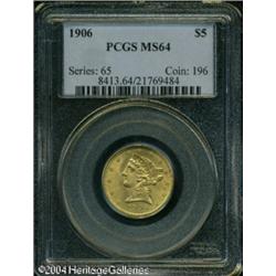 1906 $5 MS64 PCGS. A lovely near-Gem, this piece h <B>1906 $5 MS64 PCGS.</B></I> A lovely near-Gem, this piece has a pinpoint strike, full mint bloom, and pleasing surfaces. Only a hairline-thin mark in the left obverse field denies a higher grade. <BR><BR><B>Important notice:</B> Heritage usually auctions material at the rate of 200-250 lots per hour. On some occasions eBay Live bid software or the Internet may not be able to keep up with the pace of the auction. We recommend placing a realistic absentee bid now as insurance to avoid disappointment. Occasionally the auctioneer may eliminate or reject an eBay Live bid, and the auctioneer may also reopen a lot after the close of the eBay live bidding (usually because we missed an audience bid), and may reject your bid even if it shows you as the winning bidder. By bidding via eBay Live, you agree that Heritage may award the lot to another bidder at its sole discretion under the circumstances described above or any other reasonable circumstances. Since eBay bids are not shown to us until we open the lot on the floor, we treat those bids just like floor bids. In most cases the floor responds before the eBay bid is presented to us, due to Internet lag time, so for consistency we have made it a policy that floor bids are always considered first over tie eBay live bids. Also please note that all Heritage lots purchased through eBay Live carry a 20% Buyer's Premium. Please make sure you read the Terms and Conditions before you bid. This lot is being auctioned in conjunction with a live floor auction by Heritage Galleries & Auctioneers. All final auction and invoice information will be supplied by Heritage Galleries & Auctioneers, and all other information should be considered preliminary. Lot:6688