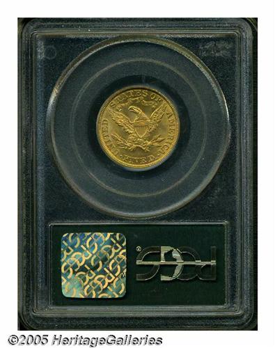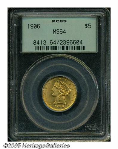 <B>1906<$5> MS64 PCGS.</B></I> Lustrous surfaces yield a pleasing mix of peach-gold, light green, and yellow coloration. The design features are sharply struck and clearly defined. A few trivial marks scattered about limit the grade. PCGS has seen 57 pieces grading higher (6/05).