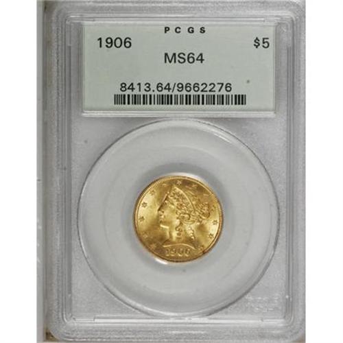 <B>1906 $5 MS64 PCGS.</B></I> Frosty lemon-yellow luster with full mint brilliance. Despite its rank as a common date, PCGS has only certified 61 finer examples (10/07).<BR><BR><B>Coin Engraver:</B> Christian Gobrecht<BR><BR><b>Shipping:</b> Coins & Currency (<a target="_blank" href="http://www.heritageauctions.com/common/shipping.php">view shipping information</a>)
