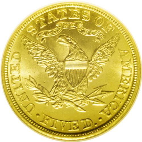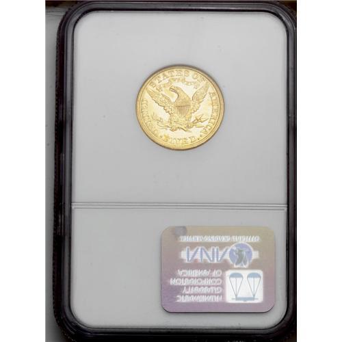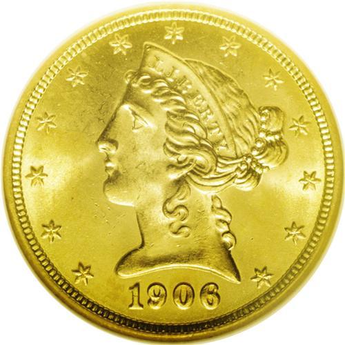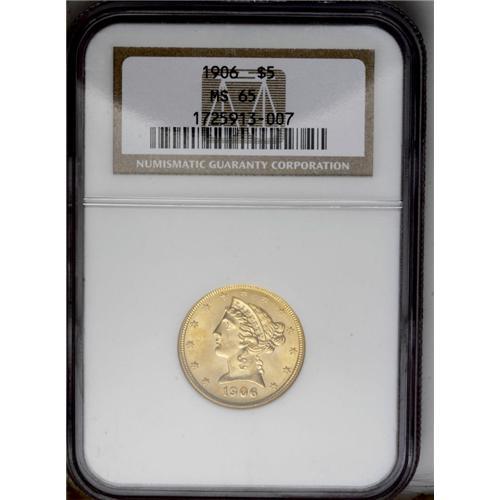 <B>1906<$5> MS65 NGC.</B></I> A sharp strike with intense mint frost on the surfaces. Both sides have brilliant yellow-gold color with splashes of vibrant lemon-yellow toning. Although not a rare date, this issue follows a pattern of half eagles that are essentially common coins, but are seldom seen in Gem condition. Census: 44 in 65, 30 finer (6/06).