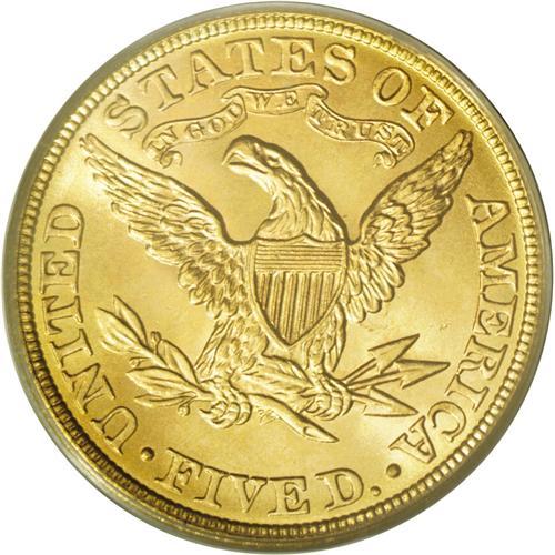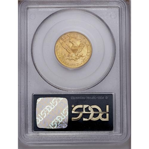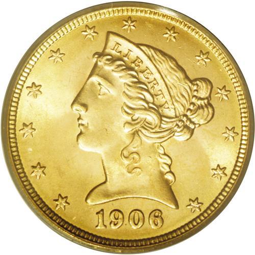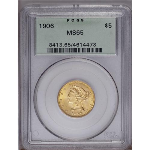 <B>1906 $5 MS65 PCGS.</B></I> Breen-6792. Described by Walter Breen as an overdate with extra remnants inside the lower loop of the digit 6. The date is heavily punched in the die. Today, we cannot be certain that this is actually an overdate, although there is clearly a die abnormality at the date. A resplendent Gem with exquisite orange-gold surfaces and bright luster. All of the design details are bold. Housed in an old green-label PCGS holder. Population: 40 in 65, 19 finer (1/06).