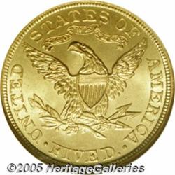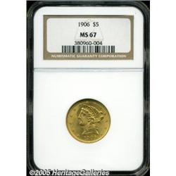 <B>1906 $5 MS67 NGC.</B></I> An outstanding specimen that has superb, creamy surfaces. The mint luster is exceptional, giving the coin a vibrancy that is missing on all but the finest examples. One immediately notices a rich overlay of green-golden color. A spectacular type coin of unparalleled quality and eye appeal. Population: 7 in 67, none finer at either service (2/05).