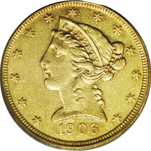 <B>1906 $5 PR53 PCGS.</B></I> Probably because of a lack of new designs, proof mintages of all denominations declined during the first decade of the 20th century. 230 proof half eagles were struck in 1900, but by 1906, only 85 proofs were struck. Despite their obvious rarity, proof gold coins carried little numismatic premium over face until the 1940s. Heirs, collectors, and even dealers often spent the pieces. This example circulated briefly, then was likely hoarded with peer gold pieces until a numismatist surmised its true nature decades later. Glimpses of radiant mirror surface remain, although the open fields display expected rub. Housed in a green label holder.<BR><I>From The Jones Beach Collection.</B></I><BR><BR><b>Shipping:</b> Coin/Currency (<a target="_blank" href="http://www.heritageauctions.com/common/shipping.php">view shipping information</a>)