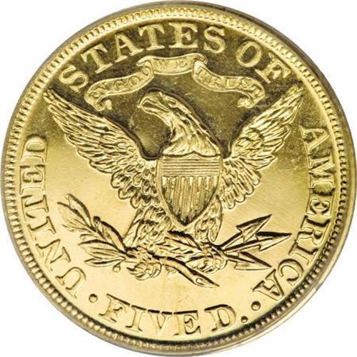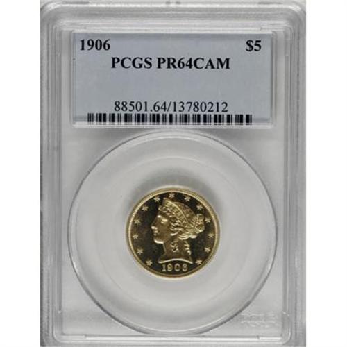 <B>1906 $5 PR64 Cameo PCGS.</B></I> A century has passed since the last proof half eagles of the Gobrecht design left the Philadelphia Mint, an anniversary that might bring renewed interest to this series, lengthy and challenging, yet immensely rewarding. The last two years, 1906 and 1907, saw decreased mintages that render them, in the words of Garrett and Guth (2006), " ... a bit more difficult to locate than some of the earlier issues."<BR> In addition, with the change in Mint procedures for preparing proof dies, few coins show the level of contrast displayed by this marvelous Choice specimen. The strike is decisive, and though the level of frost on the devices is mild, the gleaming fields and portrait show undeniable contrast. A captivating exemplar. Population: 2 in 64 Cameo, 6 finer (11/07).<BR><BR><b>Shipping:</b> Coins & Currency (<a target="_blank" href="http://www.heritageauctions.com/common/shipping.php">view shipping information</a>)