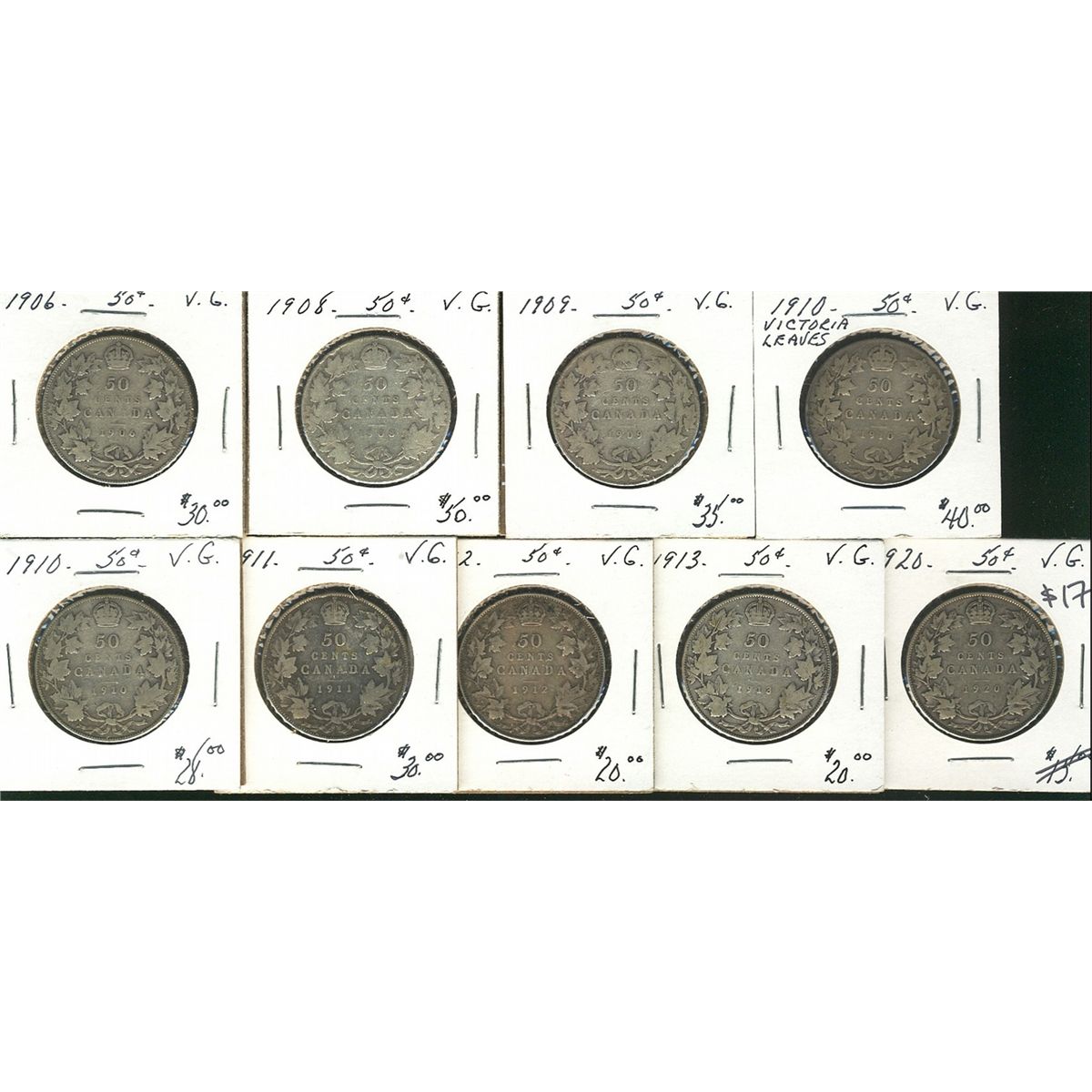 1906 50¢, 1908, 1909, 1910VL, 1910EL, 1911, 1912, 1913 & 1920. Lot of 9 coins all VG. (PBA).