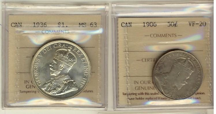 1906 50¢ VF20 & 1936 $1 MS63. Lot of 2 certified examples.