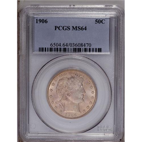 <B>1906<50C> MS64 PCGS.</B></I> Sharply struck with delightful champagne toning over the obverse and lovely lime-gray color on the reverse. Essentially abrasion-free with a few faint luster grazes in the right obverse field and a minor nick at the corner of Liberty's mouth. Population: 61 in 64, 23 finer (1/06).