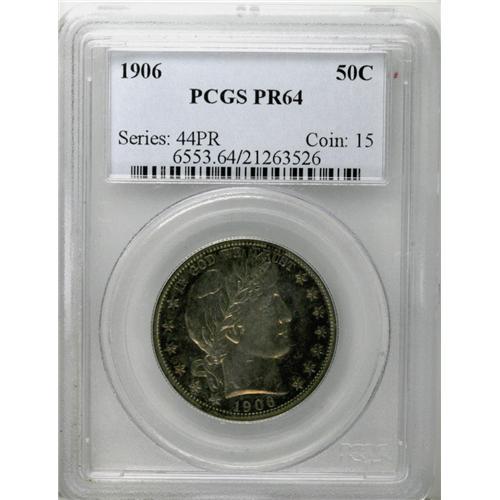 <B>1906<50C> PR64 PCGS.</B></I> Deeply toned with golden-brown color over the reverse and variations of purple-rose and cobalt-blue on the obverse. Sharply struck and free of noticeable handling marks, with nice reflectivity in the fields.