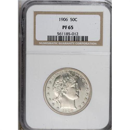 <B>1906 50C PR65 NGC.</B></I> The devices demonstrate frost, especially on the reverse, but the portrait contrast falls just shy of receiving a Cameo designation. An untoned and flashy Gem that has fully struck fletchings and only moderate incompleteness on the right shield corner. A stingy 675 proofs were struck.<BR><BR><B>Coin Engraver:</B> Charles E. Barber<BR><BR><b>Shipping:</b> Coins & Currency (<a target="_blank" href="http://www.heritageauctions.com/common/shipping.php">view shipping information</a>)