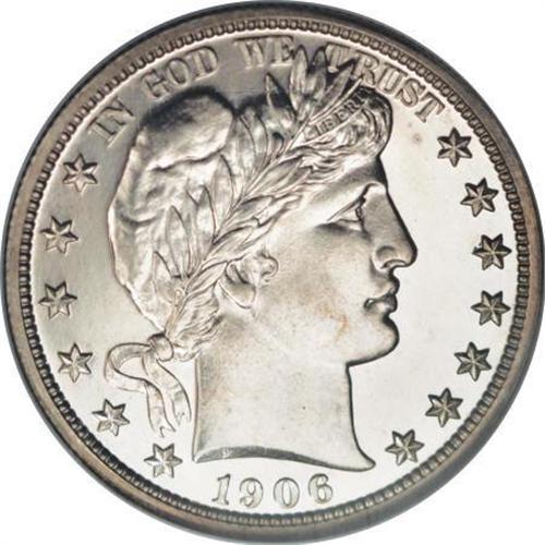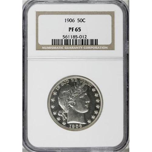 <B>1906 50C PR65 NGC.</B></I> The devices show frost, especially on the reverse, but the portrait contrast falls just shy of receiving a Cameo designation. This untoned and flashy Gem has fully struck fletchings and only moderate incompleteness on the right shield corner and nearby wing top. A stingy 675 proofs were struck.<BR><BR><B>Coin Engraver:</B> Charles E. Barber<BR><BR><b>Shipping:</b> Coins & Currency (<a target="_blank" href="http://www.heritageauctions.com/common/shipping.php">view shipping information</a>)