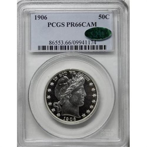 <B>1906 50C PR66 Cameo PCGS. CAC.</B></I> The 1906 proof half dollar comes from a mintage of 675 pieces, most of which have survived to the present day, if PCGS/NGC population figures are any indication. Fewer than 20 specimens have been given a Cameo designation, however. The frosted devices of this Premium Gem stand out in relation to the deep mirror fields, both of which are completely untoned. Sharply struck and immaculately preserved. Population: 4 in 66 Cameo, 2 finer (11/07).<BR><I>From The Kallenberg #1 PCGS Registry Set Of Proof Half Dollars.</B></I><BR><BR><b>Shipping:</b> Coins & Currency (<a target="_blank" href="http://www.heritageauctions.com/common/shipping.php">view shipping information</a>)