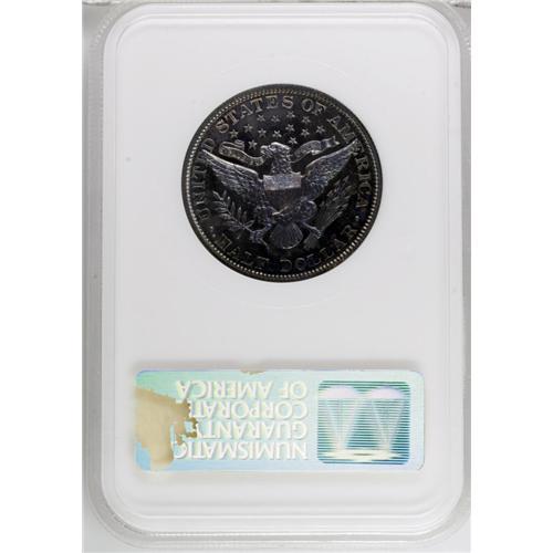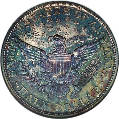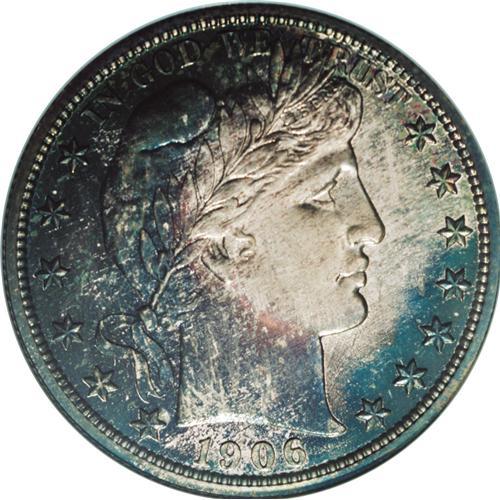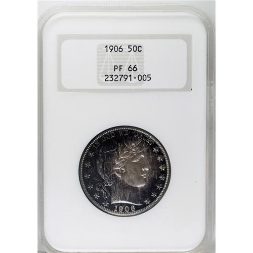 <B>1906 50C PR66 NGC.</B></I> The unusual, but delicate and lovely toning is brilliant in places, steel-blue in others, accented by purple, mint-green and amber-gold. This piece is highly reflective despite the palette of colors. The dwindling proof mintages throughout the series reflect public apathy toward the Charles Barber-designed coins that increased with time. From a series-high 1,245 pieces in 1892, by 1906 only 675 proofs were produced, culminating in 1915 with 450 coins.<BR><BR><b>Shipping:</b> Coin/Currency (<a target="_blank" href="http://www.heritageauctions.com/common/shipping.php">view shipping information</a>)