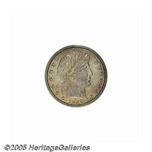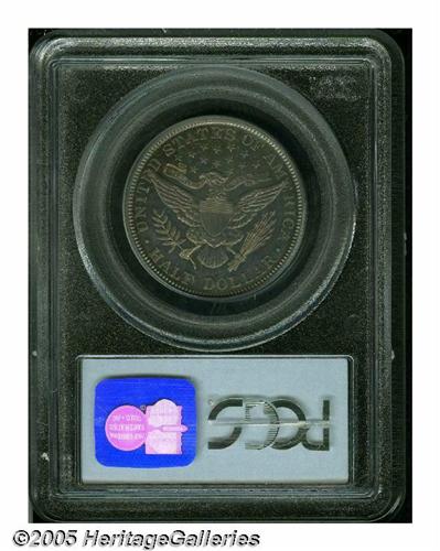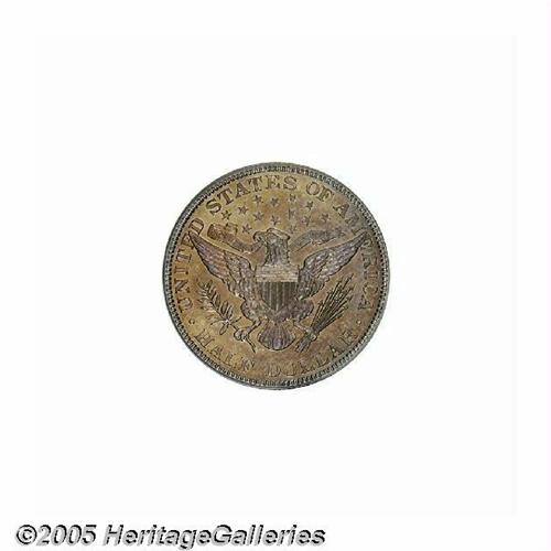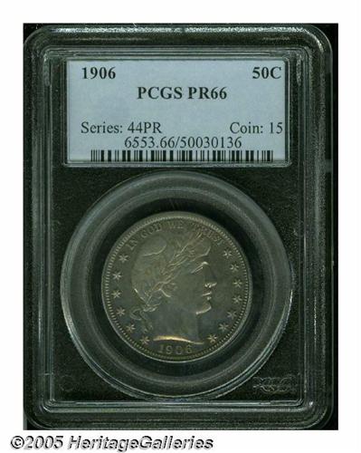 <B>1906<50C> PR66 PCGS.</B></I> Vivid peach and lavender colors swirl about this nearly pristine premium Gem. Intricately struck, as only the right tip of the shield has not been completely brought up the dies. The obverse is lightly die doubled, most noticeable on the tops of IN GOD WE TRUST. A scant 675 pieces were struck.