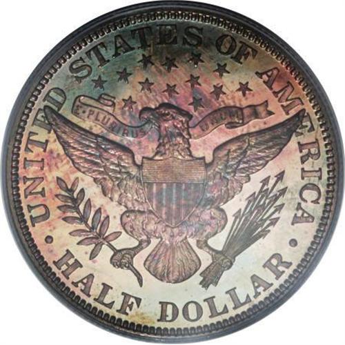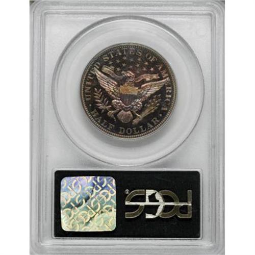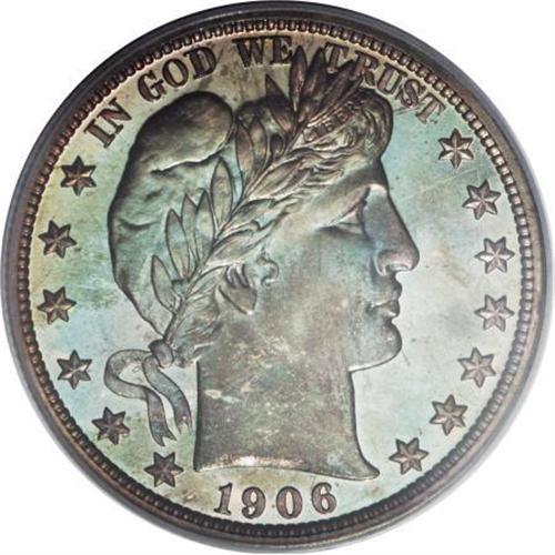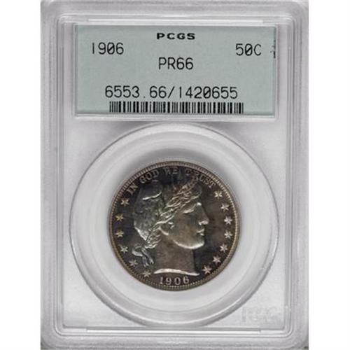 <B>1906 50C PR66 PCGS. CAC.</B></I> "Impressively low" is an accurate way to describe the mintage of many proofs in the Barber series. In the case of the 1906 half, only 675 pieces were struck. This is a fabulous piece. The surfaces are toned in rich shadings of sea-green, golden, and rose on the obverse; while the reverse has bright rose and blue-green colors present. The fields are deeply reflective and the devices have a significant amount of frost present, but it is not quite pronounced enough to be an obvious cameo through the layers of toning. <BR><I>From The Chandler Collection.</B></I><BR><BR><B>Coin Engraver:</B> Charles E. Barber<BR><BR><b>Shipping:</b> Coins & Currency (<a target="_blank" href="http://www.heritageauctions.com/common/shipping.php">view shipping information</a>)