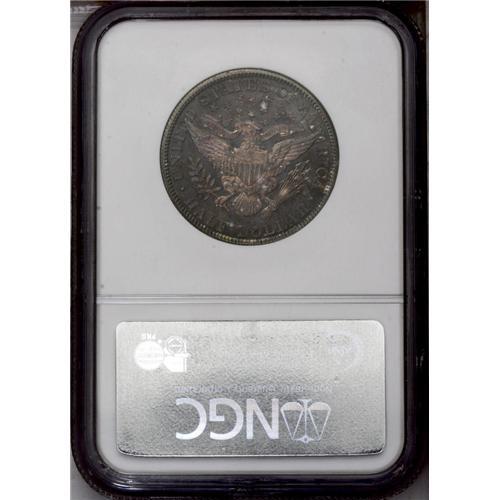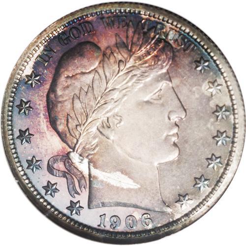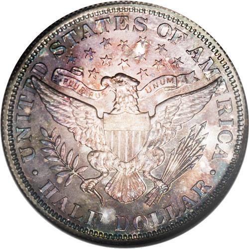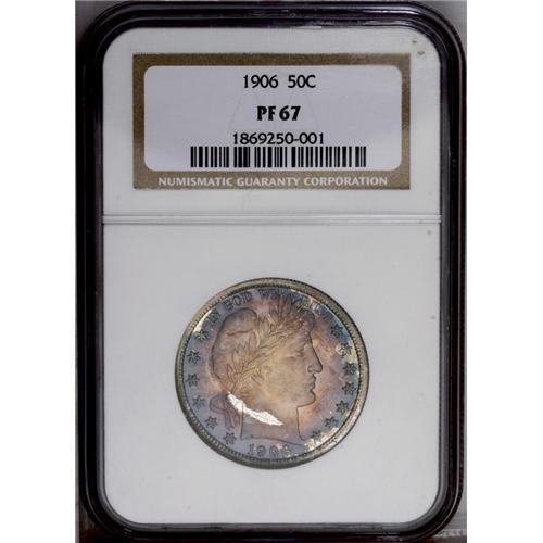 <B>1906<50C> PR67 NGC.</B></I> Golden-brown centers are surrounded by deeper bands of plum and cobalt-blue patina. Splashes of forest-green toning adorn the reverse margin. The strike is bold, even on the fletchings and right shield corner, which often exhibit weakness on this type. Only 675 proofs were struck. Census: 14 in 67, 4 finer (1/06).