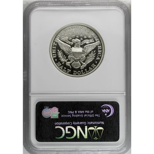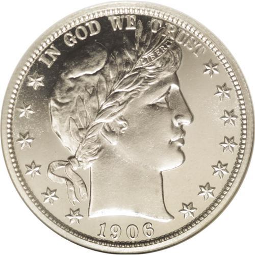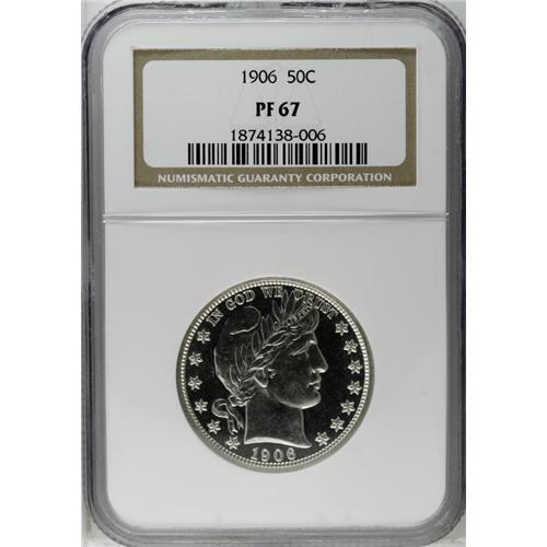<B>1906<50C> PR67 NGC.</B></I> The fields have an unfathomable depth of mirrored reflectivity, giving the piece a shimmering, watery appearance. The coin presents as fully brilliant, and there are no mentionable marks or pedigree identifiers. Some squiggly die polish lines are noted just under Liberty's ear. Census: 15 in 67, 4 finer (6/06).<BR><I>From The Mulholland Collection.</B></I>