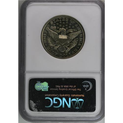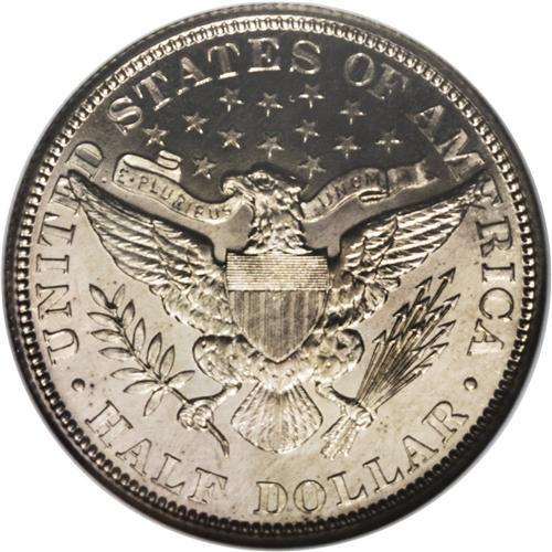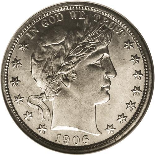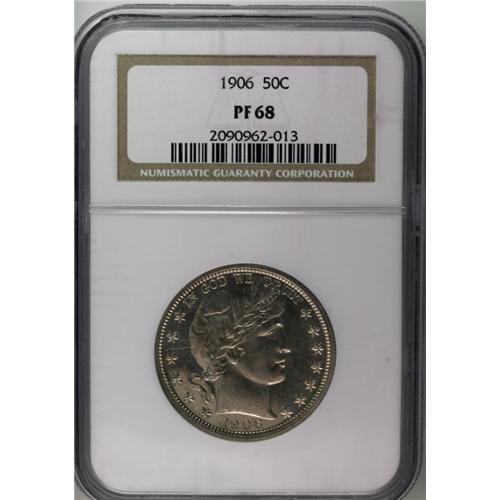 <B>1906<50C> PR68 NGC.</B></I> This Superb Gem proof is tied with three other pieces as the finest known of the issue, of which 675 pieces were coined. The silvery surfaces show just a slight golden cast on both sides. There is considerable field-device contrast, although insufficient for an official designation. The nearly full strike brings up details not normally seen, even on lesser proofs--the tiny fold of skin at the top of Liberty's eyelid is plain--but there is a bit of softness on the top right (facing) eagle's wing. This is the only distraction we see, as the fields and devices are seemingly free of even the most picayune impairments. Census: 4 in 68, 0 finer (8/06).