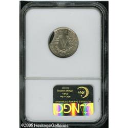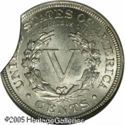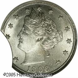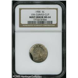 <B>1906 5C Liberty Nickel--15% Curved Clip--MS64 NGC.</B></I> Clipped planchet at 8 o'clock. This is a Choice Mint State example with fully lustrous and frosty nickel-gray color and only the faintest trace of champagne toning. As a general category, Liberty Nickel errors are quite rare, and among those, Mint State examples are major rarities. Lot:10943