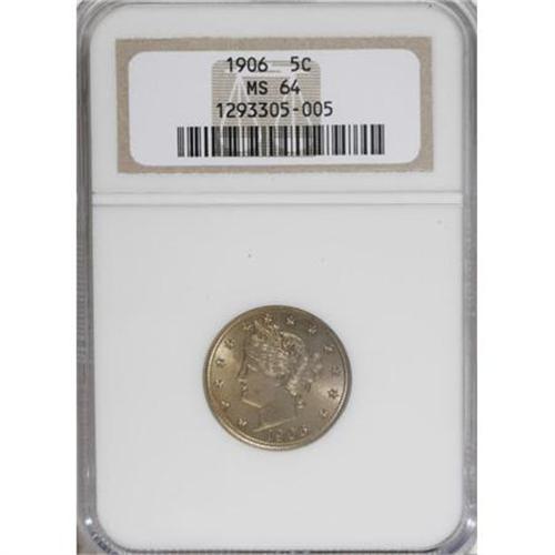 <B>1906 5C MS64 NGC.</B></I> NGC Census: (175/72). PCGS Population (230/133). Mintage: 38,613,724. Numismedia Wsl. Price for NGC/PCGS coin in MS64: $180. (#3867)<BR><BR><B>Coin Engraver:</B> Charles E. Barber<BR><BR><b>Shipping:</b> Coins & Currency (<a target="_blank" href="http://www.heritageauctions.com/common/shipping.php">view shipping information</a>\)