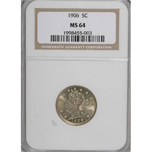 <B>1906 5C MS64 NGC.</B></I> NGC Census: (177/72). PCGS Population (231/135). Mintage: 38,613,724. Numismedia Wsl. Price for NGC/PCGS coin in MS64: $180. (#3867)<BR><BR><B>Coin Engraver:</B> Charles E. Barber<BR><BR><b>Shipping:</b> Coins & Currency (<a target="_blank" href="http://www.heritageauctions.com/common/shipping.php">view shipping information</a>)