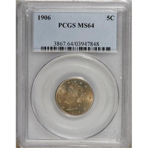 <B>1906 5C MS64 PCGS.</B></I> PCGS Population (233/132). NGC Census: (174/72). Mintage: 38,613,724. Numismedia Wsl. Price for NGC/PCGS coin in MS64: $180. (#3867)<BR><BR><b>Shipping:</b> Coins & Currency (<a target="_blank" href="http://www.heritageauctions.com/common/shipping.php">view shipping information</a>)
