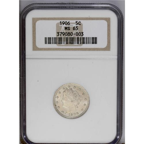 <B>1906<5C> MS65 NGC.</B></I> A few light abrasions and tiny carbon flecks limit the grade of this brilliant and lustrous Gem. Both sides are fully brilliant with wispy gold color. A lovely example of this slightly scarce date. Census: 68 in 65, 5 finer (4/06).