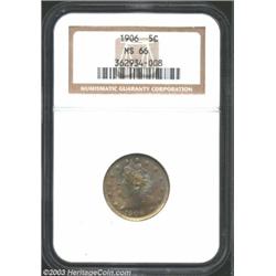 1906 5C MS66 NGC. A well struck Gem with gorgeous multicolored toning. The obverse is a rich mauve-b