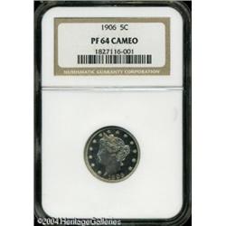1906 5C PR64 Cameo NGC. The surfaces are nearly un <B>1906 5C PR64 Cameo NGC.</B></I> The surfaces are nearly untoned, and exhibit a sharp cameo contrast and well defined design elements with no mentionable abrasions. <BR><BR><B>Important notice:</B> Heritage usually auctions material at the rate of 200-250 lots per hour. On some occasions eBay Live bid software or the Internet may not be able to keep up with the pace of the auction. We recommend placing a realistic absentee bid now as insurance to avoid disappointment. Occasionally the auctioneer may eliminate or reject an eBay Live bid, and the auctioneer may also reopen a lot after the close of the eBay live bidding (usually because we missed an audience bid), and may reject your bid even if it shows you as the winning bidder. By bidding via eBay Live, you agree that Heritage may award the lot to another bidder at its sole discretion under the circumstances described above or any other reasonable circumstances. Since eBay bids are not shown to us until we open the lot on the floor, we treat those bids just like floor bids. In most cases the floor responds before the eBay bid is presented to us, due to Internet lag time, so for consistency we have made it a policy that floor bids are always considered first over tie eBay live bids. Also please note that all Heritage lots purchased through eBay Live carry a 20% Buyer's Premium. Please make sure you read the Terms and Conditions before you bid. This lot is being auctioned in conjunction with a live floor auction by Heritage Galleries & Auctioneers. All final auction and invoice information will be supplied by Heritage Galleries & Auctioneers, and all other information should be considered preliminary. Lot:5553