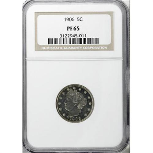 <B>1906 5C PR65 NGC.</B></I> NGC Census: (99/76). PCGS Population (85/50). Mintage: 1,725. Numismedia Wsl. Price for NGC/PCGS coin in PR65: $495. (#3904)<BR><BR><B>Coin Engraver:</B> Charles E. Barber<BR><BR><b>Shipping:</b> Coins & Currency (<a target="_blank" href="http://www.heritageauctions.com/common/shipping.php">view shipping information</a>)