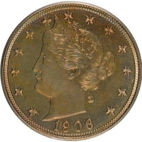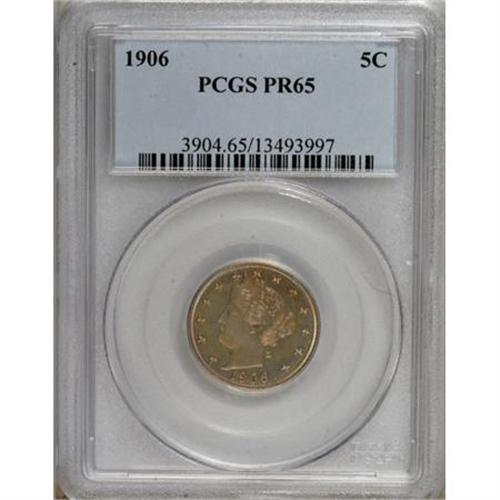 <B>1906 5C PR65 PCGS.</B></I> PCGS Population (83/51). NGC Census: (94/77). Mintage: 1,725. Numismedia Wsl. Price for NGC/PCGS coin in PR65: $492. (#3904)<BR><BR><B>Coin Engraver:</B> Charles E. Barber<BR><BR><b>Shipping:</b> Coins & Currency (<a target="_blank" href="http://www.heritageauctions.com/common/shipping.php">view shipping information</a>)