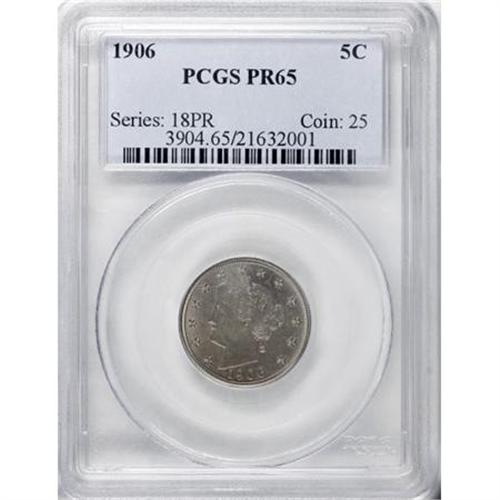 <B>1906 5C PR65 PCGS.</B></I> PCGS Population (85/50). NGC Census: (99/76). Mintage: 1,725. Numismedia Wsl. Price for NGC/PCGS coin in PR65: $495. (#3904)<BR><BR><B>Coin Engraver:</B> Charles E. Barber<BR><BR><b>Shipping:</b> Coins & Currency (<a target="_blank" href="http://www.heritageauctions.com/common/shipping.php">view shipping information</a>)